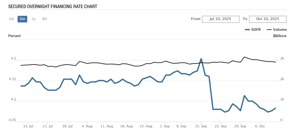理解了这一机制之后,我们再来看上图就明白了:9 月 15 日左右,SOFR 短暂出界:突破了 4.5% 的上限(当时美联储政策利率 FFR 还是 4.25-4.5%)。这就是鲍威尔嘴里所说的:「特定日期出现的更明显但暂时的压力」。