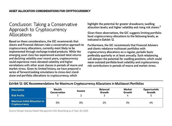 该公司的自动投资组合系统实时跟踪每位客户的加密资产敞口,以防止过度集中。摩根士丹利的全球投资委员会建议,对于年轻或激进的投资者,“机会增长”投资组合分配 4%,平衡增长投资组合分配 2%,而保值或收入策略则为 0%。