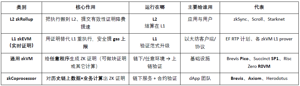 而在以太坊生态之外,零知识证明(ZKP)技术也延伸至更广泛的 通用可验证计算(Verifiable Computing) 领域,形成以 zkVM 与 zkCoprocessor 为核心的两类技术体系。