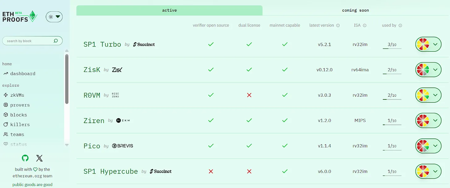 目前,以太坊基金会支持的 ETHProofs.org 已成为 L1 zkEVM 实时证明(Realtime Proving, RTP)路线的核心追踪平台,用于公开展示各 zkVM 的性能、安全与主网适配进展。