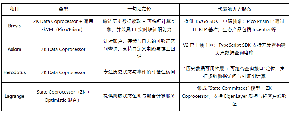 当前 zk-Coprocessor 赛道已形成以 Brevis、Axiom、Herodotus、Lagrange 为代表的格局。 其中 Brevis 以「ZK 数据协处理器 + 通用 zkVM」融合架构领先,兼具历史数据读取、可编程计算与 L1 RTP 能力;Axiom 聚焦可验证查询与电路回调;Herodotus 专注历史状态访问;Lagrange 以 ZK+Optimistic 混合架构优化跨链计算性能。 整体来看,zk-Coprocessor 正以“可验证服务层”的方式成为连接 DeFi、RWA、AI、身份 等应用的可信计算接口。