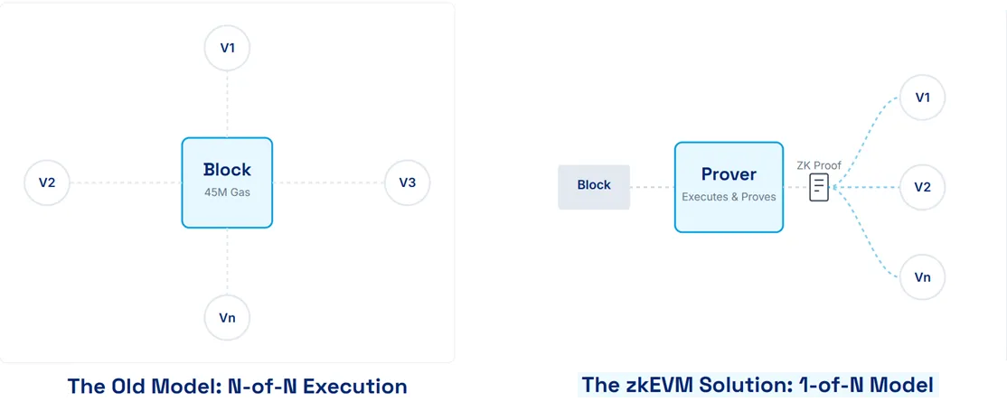 1 of N 新范式:由少数 prover 执行整块并产出短证明;全网只做常数时间验证。验证成本远低于重执行,可安全提高 L1 gas 上限,并减少硬件要求。