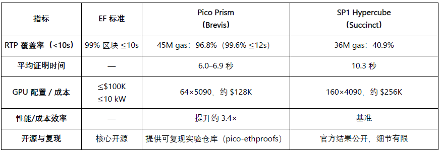 硬件策略: 在 64×RTX 5090 GPU(约 $128K)配置下,Pico Prism 实现 6.0–6.9 秒平均证明时间、96.8% RTP 覆盖率,性能/成本比提升约 3.4 倍,较 SP1 Hypercube(160×4090 GPU,10.3 秒)表现更优。