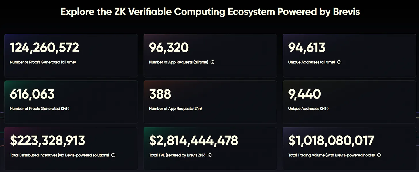 根据 Brevis Explorer 数据,截至 2025 年 10 月,Brevis 网络 已累计生成超 1.25 亿条 ZK 证明,覆盖 近 9.5 万个地址、9.6 万次应用请求,广泛服务于奖励分发、交易验证与质押证明等场景。生态层面,平台累计分发激励约 2.23 亿美元,支撑的 TVL 超 28 亿美元,相关交易量累计突破 10 亿美元。