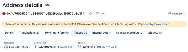 截至写这篇文章时(约22:30左右),黑客的第一接手地址上还存留有价值9500多万美刀的各类代币。